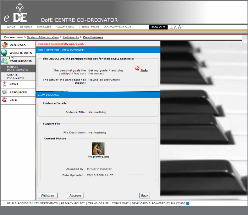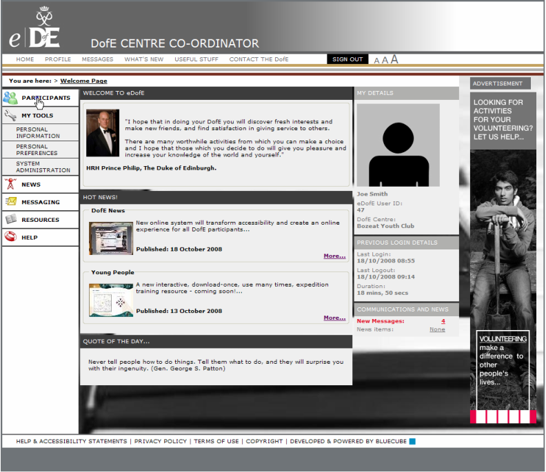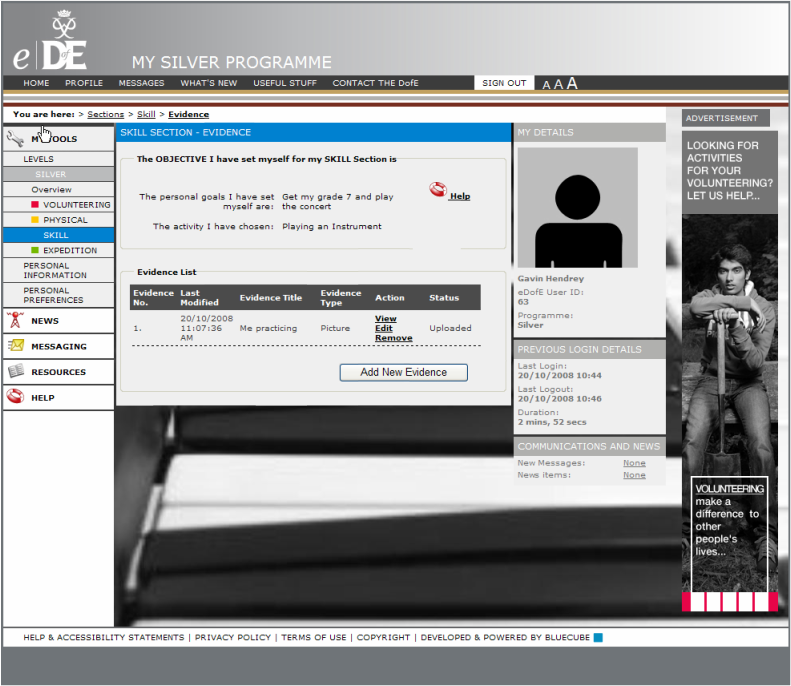 Developed first online portal for participants to record evidence and keep informed of their Award progress for the successful pilot in October 2008, leading to the launch of full eDofE throughout The Duke of Edinburgh's Award schemes.
