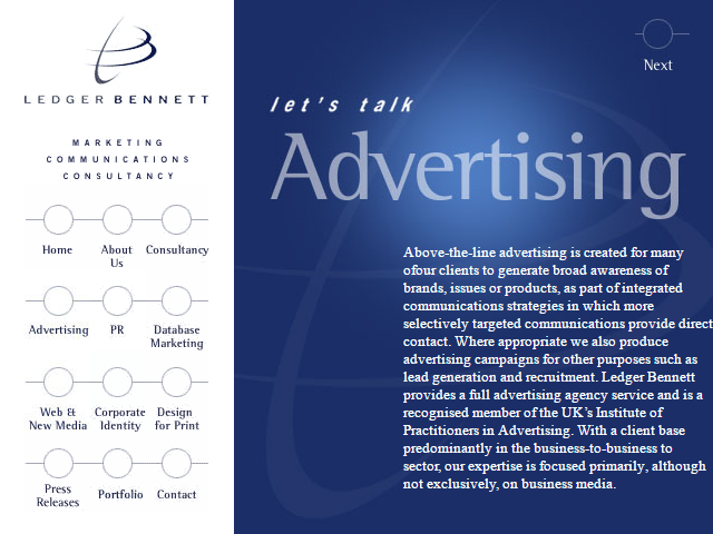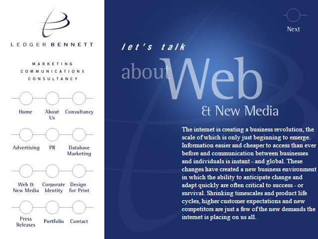 Created the first web site for the Advertising / Marketing Communications agency, Ledger Bennett in 1999, an early public internet web site, launching the new media services.